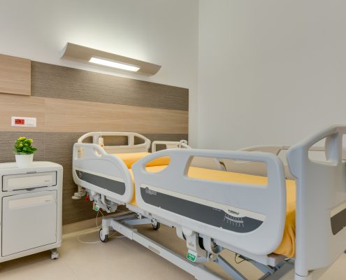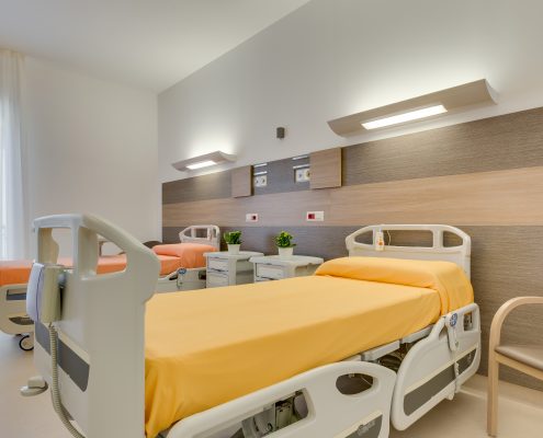 In tutte le camere, nascosti da pannelli, vi sono i gas medicali a parete (ossigeno, aspirazione, vuoto.